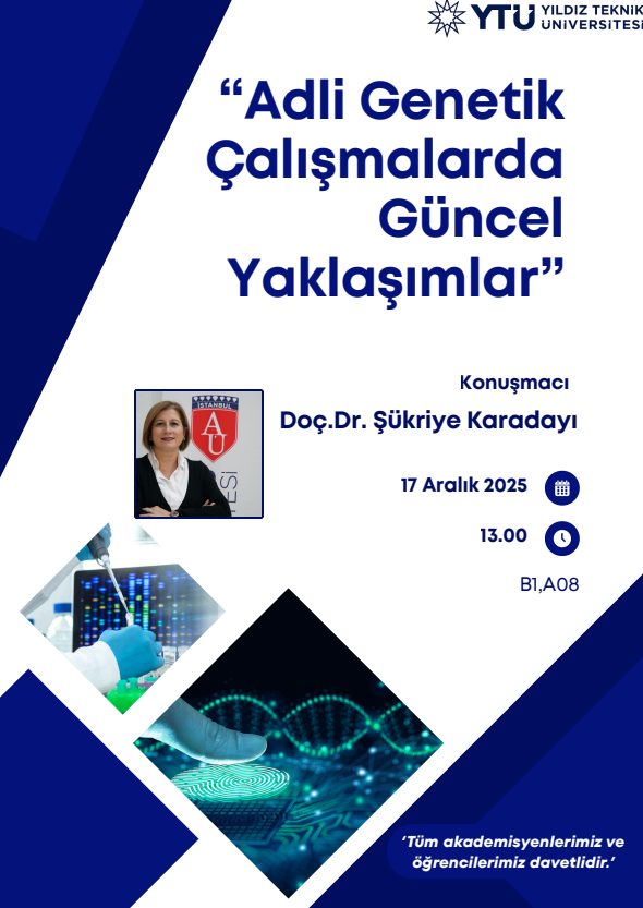17 Aralık Çarşamba Saat: 13:00' da B1-A08'de Doç. Dr. Şükriye Karadayı tarafından "Adli Genetik Çalışmalarda Güncel Yaklaşımlar" konulu seminer verilecektir. Tüm akademisyenlerimiz ve öğrencilerimiz davetlidir.