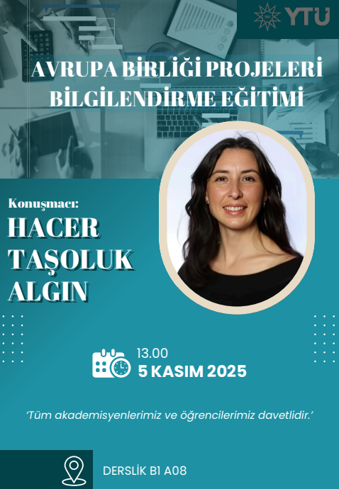 5 Kasım Çarşamba Saat: 13:00' da B1-A08'de Hacer Taşoluk Algın tarafından "Avrupa Birliği Projeleri Bilgilendirme Eğitimi" verilecektir. Tüm akademisyenlerimiz ve öğrencilerimiz davetlidir.